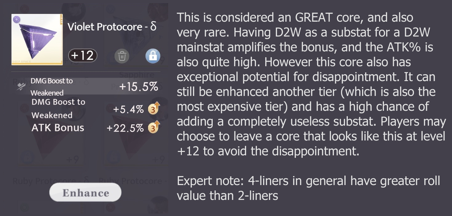 Do NOT enhance straight to “Max Level”, especially if the core has fewer than 4 substats. Level +9 and +12 cores can provide similar stats without the heavy price. Level +15 cores are only recommended for endgame combat (200+ stable open orbit stages, fluctuant open orbit stages, brute forcing SHC).